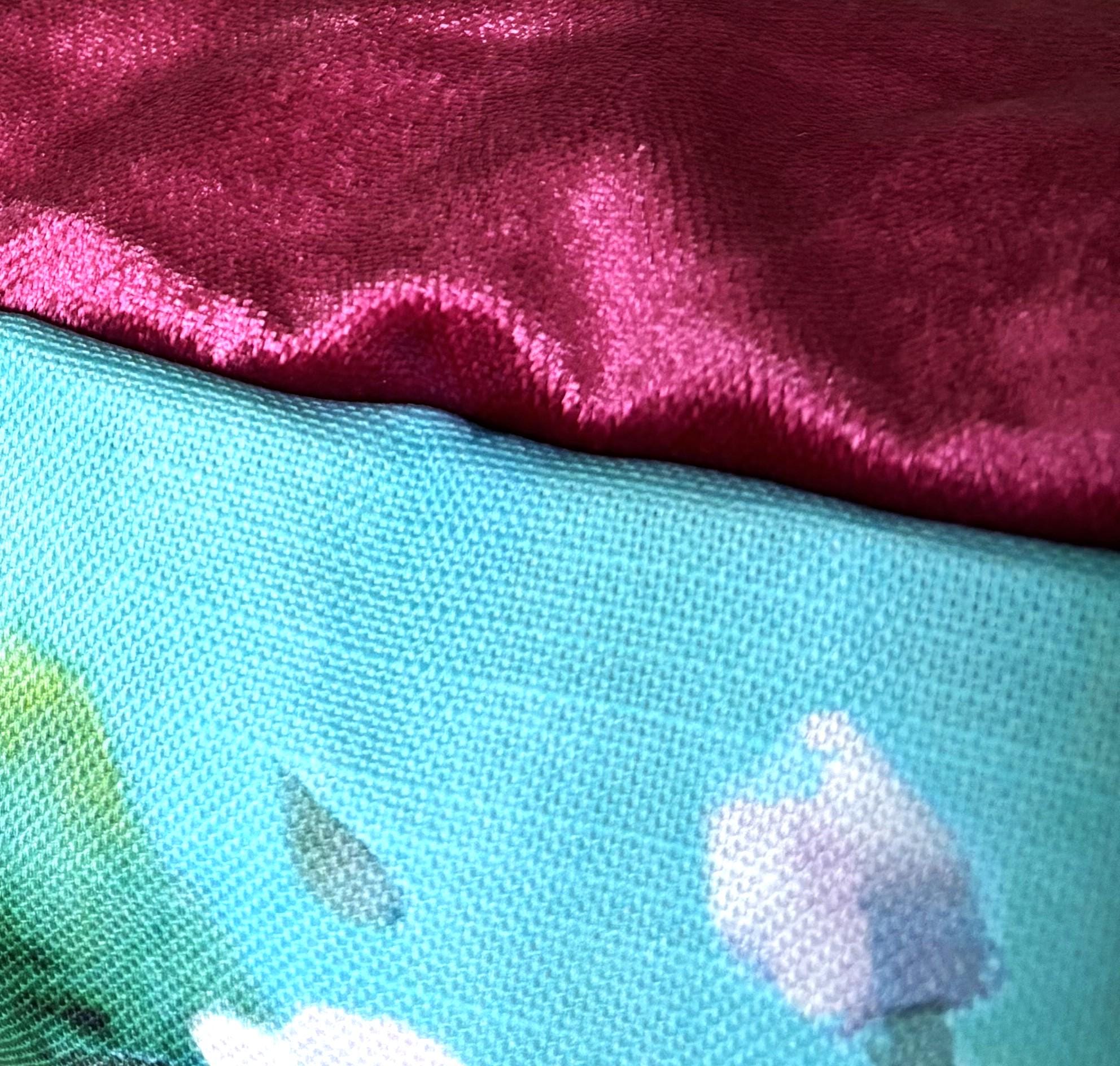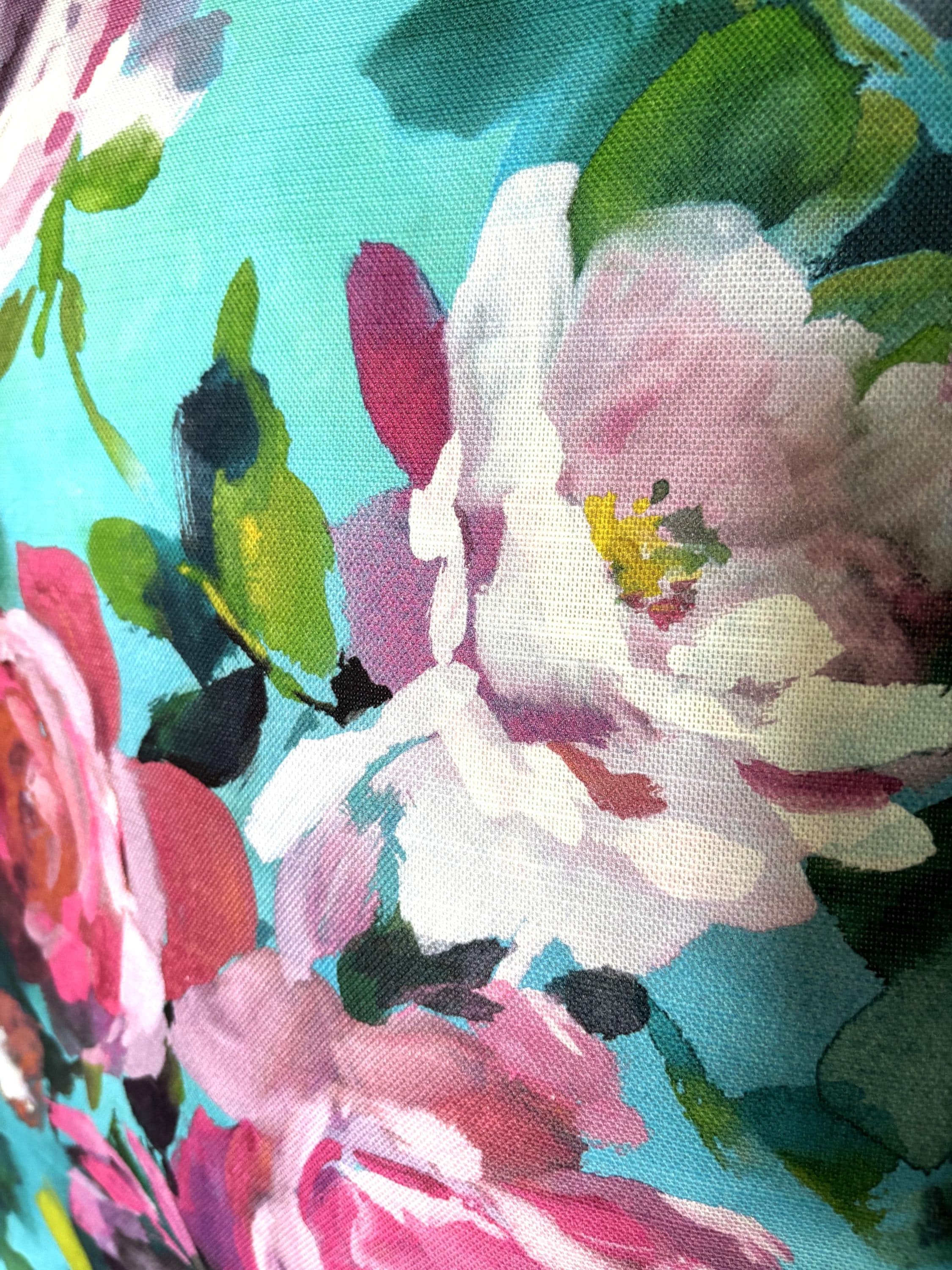 A lively painterly impression of bouquets of summer roses in shades of magenta and violet on a vibrant turquoise ground. This elegant floral design is digitally printed on a washable pure cotton with a fine slubbed texture.