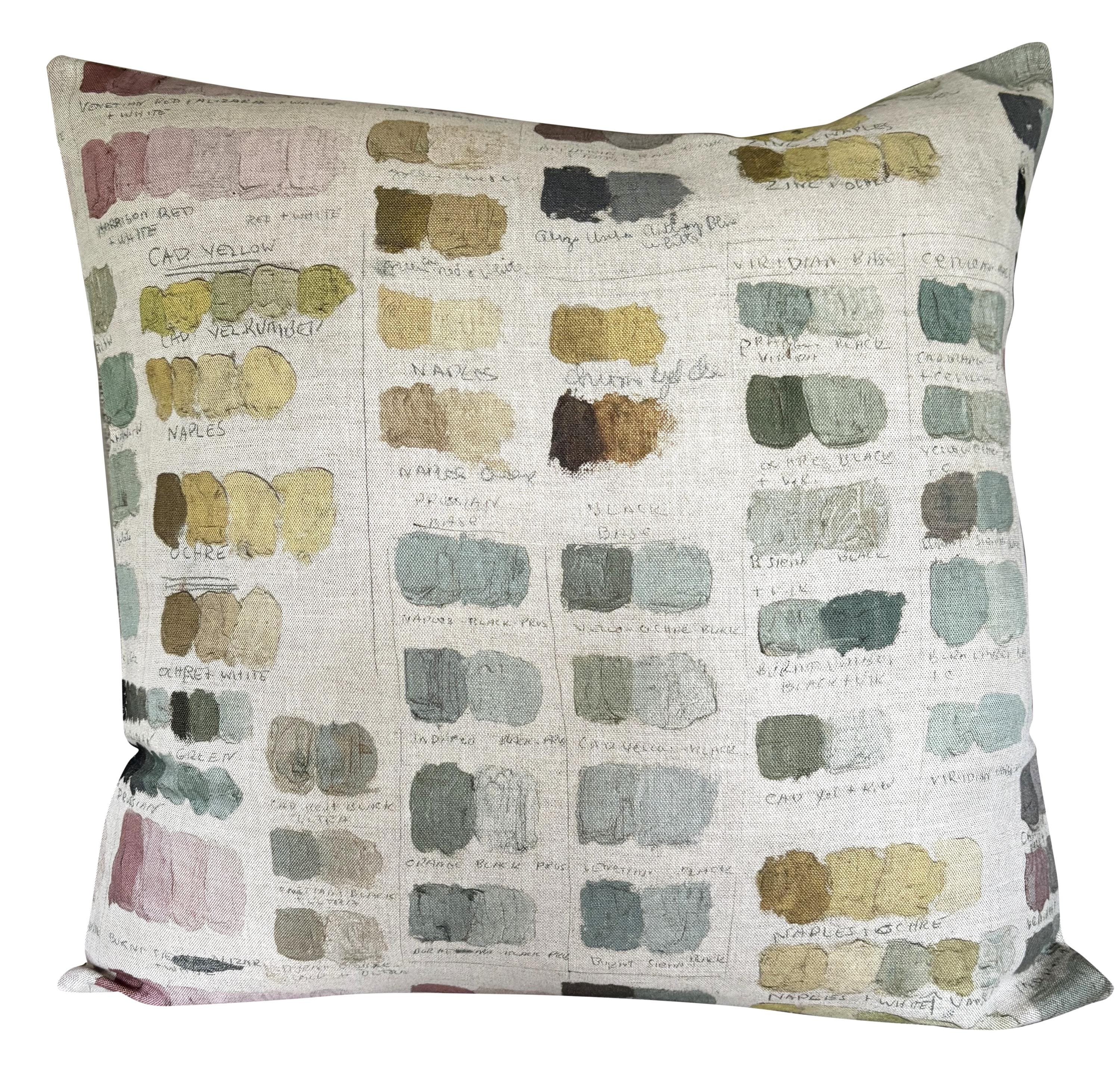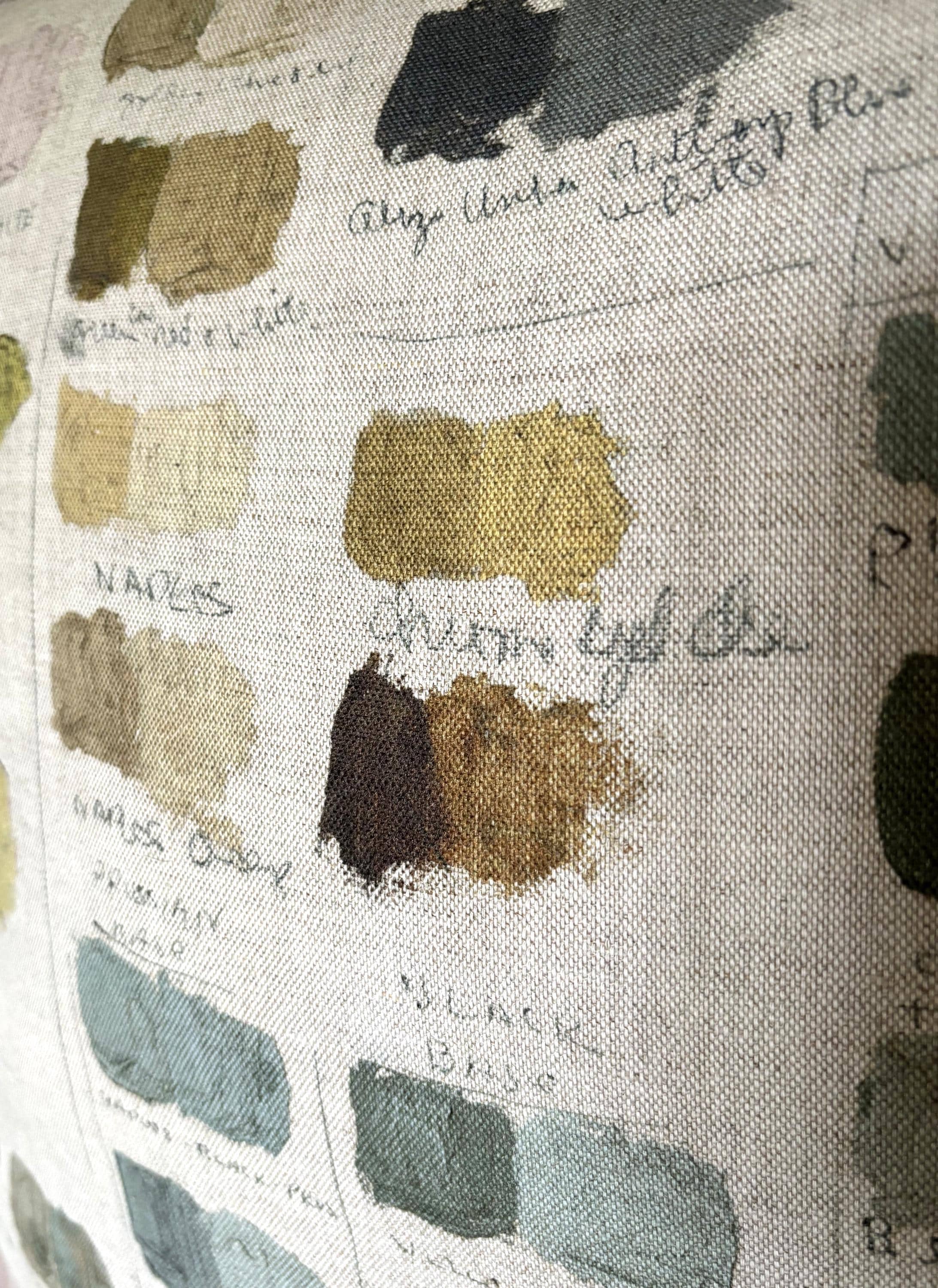 An entirely charming and intimate display of the artist's palette. This stunning spectrum of colour is beautifully illustrated by hand written notes and names, adding to the design's authentic charm and is countered by a linen-rich neutral ground.