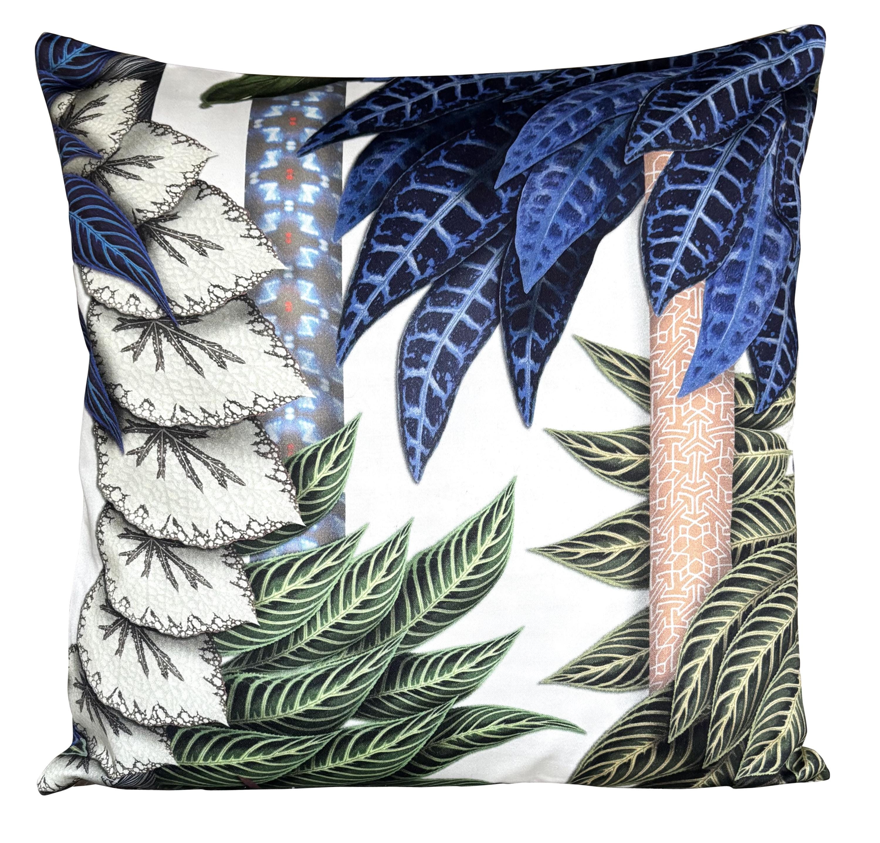 Stylised graphic forms imbue a forest landscape of swirling leaves with shimmering silk ribbon wrapped trunks. This impactful design is digitally printed onto a sleek washable cotton satin.
