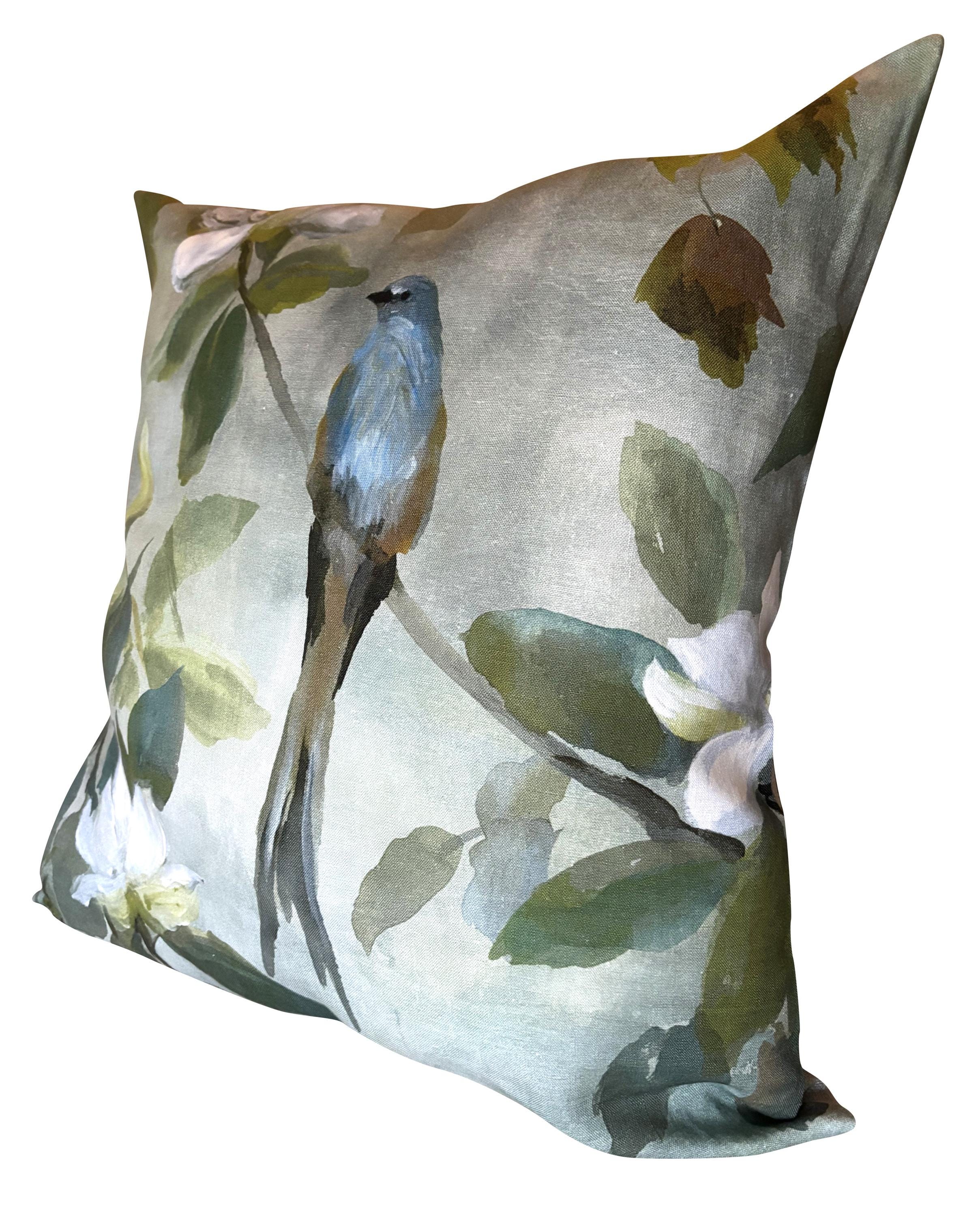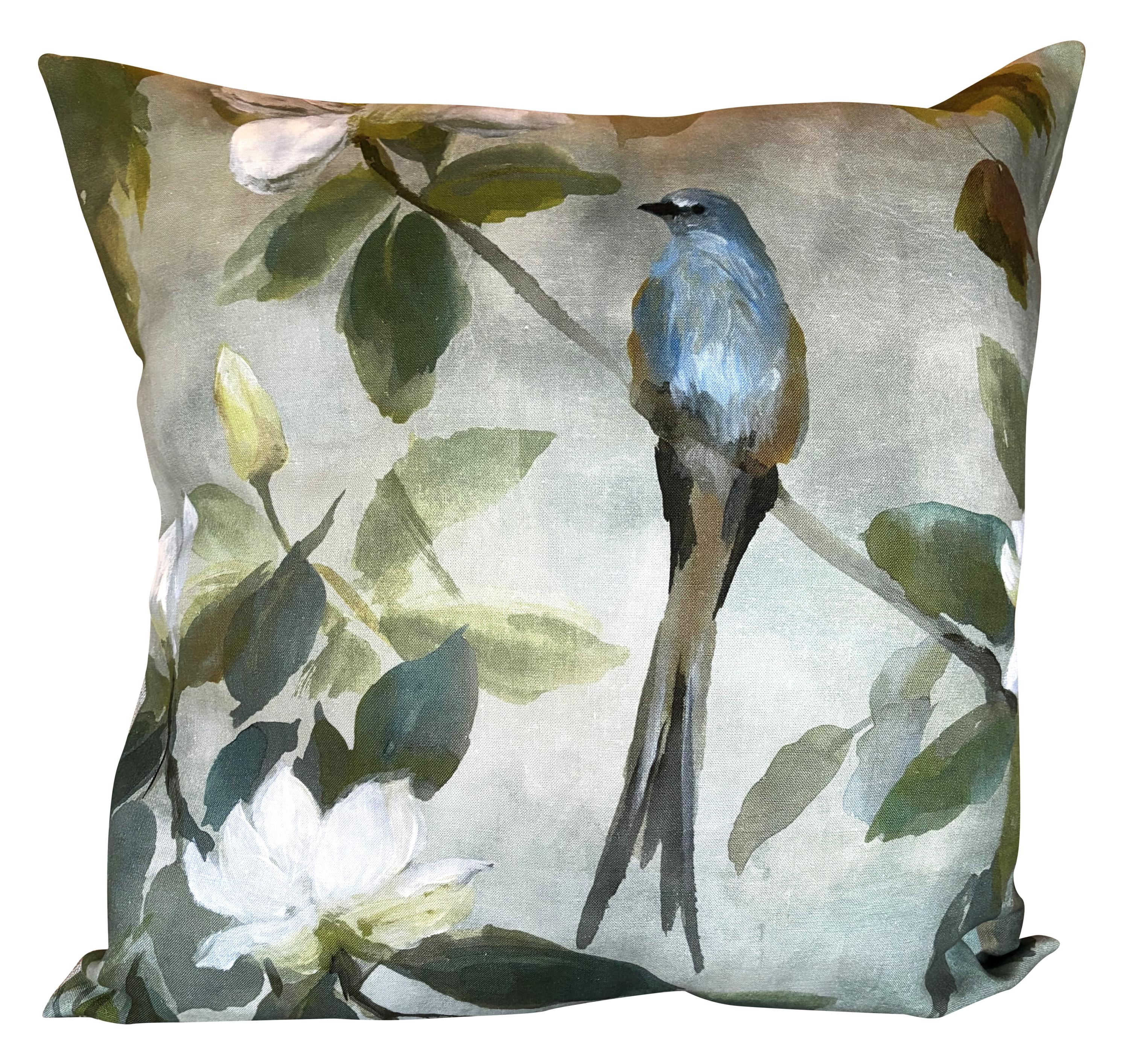 Painterly watercoloured leaves and blossoming magnolia are realised in the most blissful of shades. This design is digitally printed, for wondrous depth of colour, onto a pure linen ground.