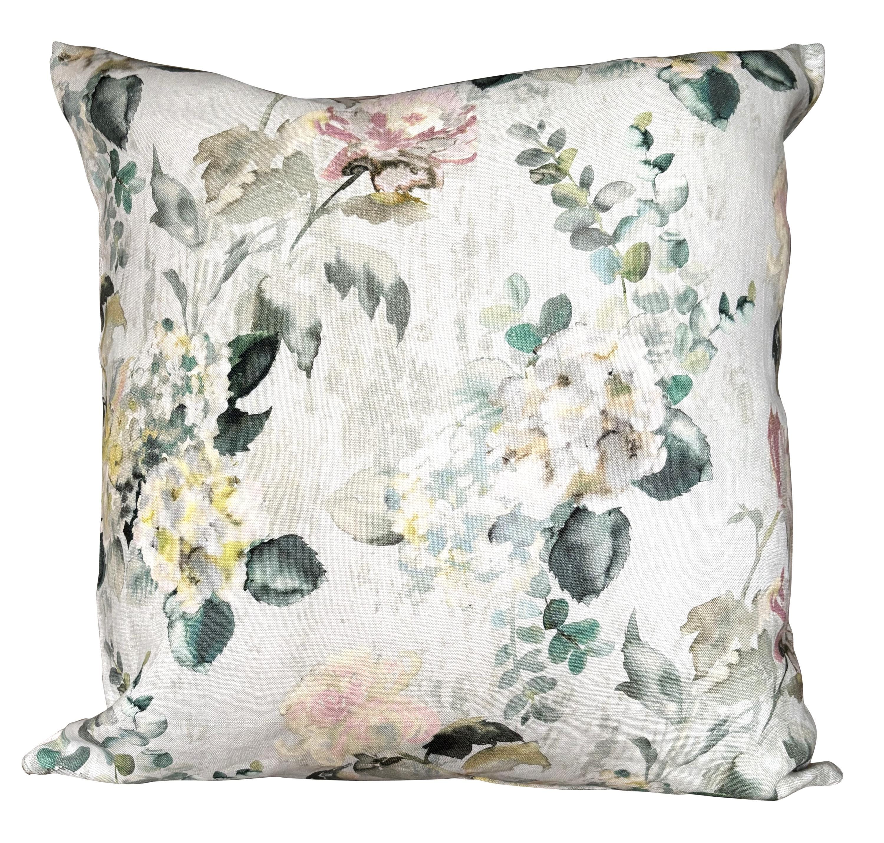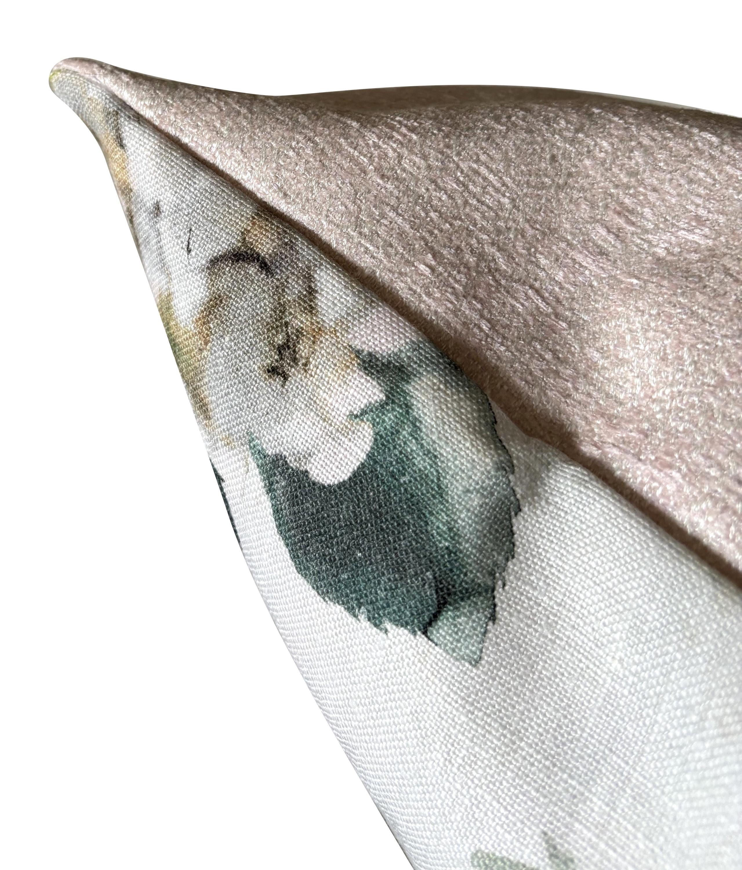 This lovely fabric is backed with luxurious blush pink velvet chenille and the cover has a concealed zip on the bottom seam.