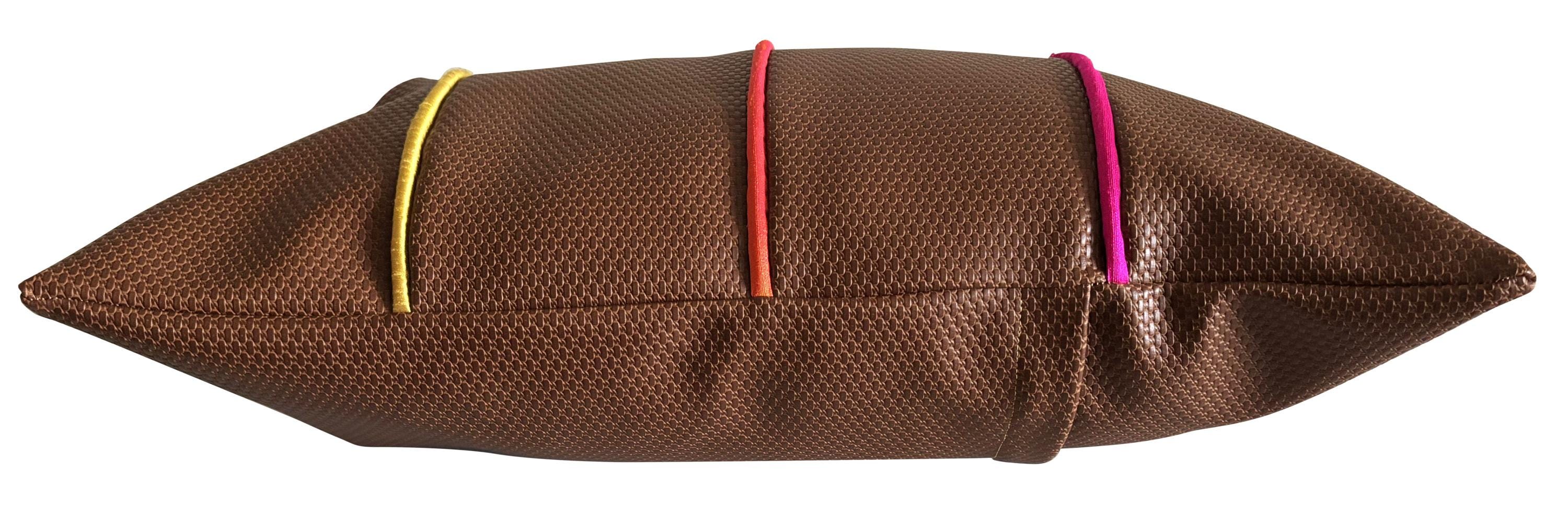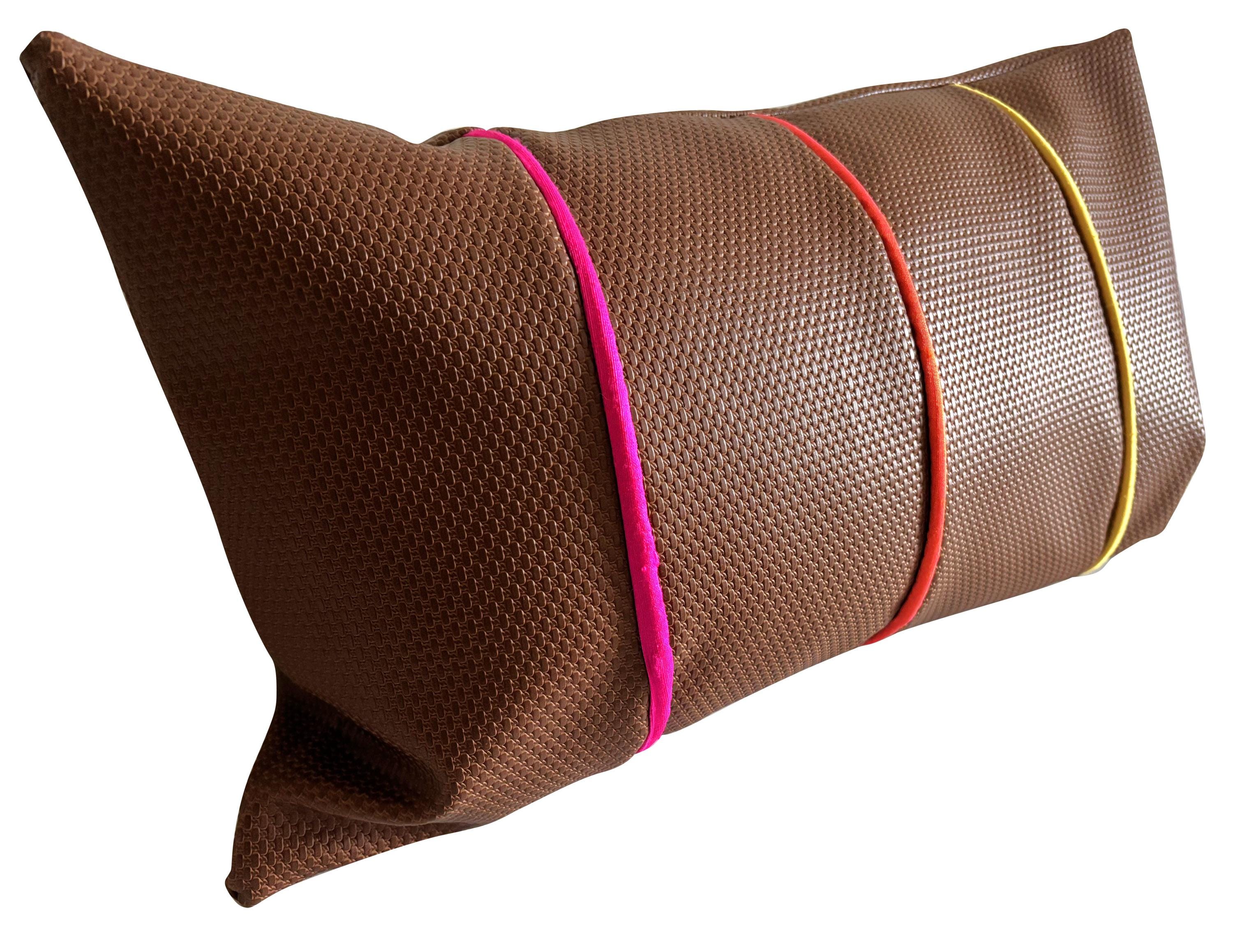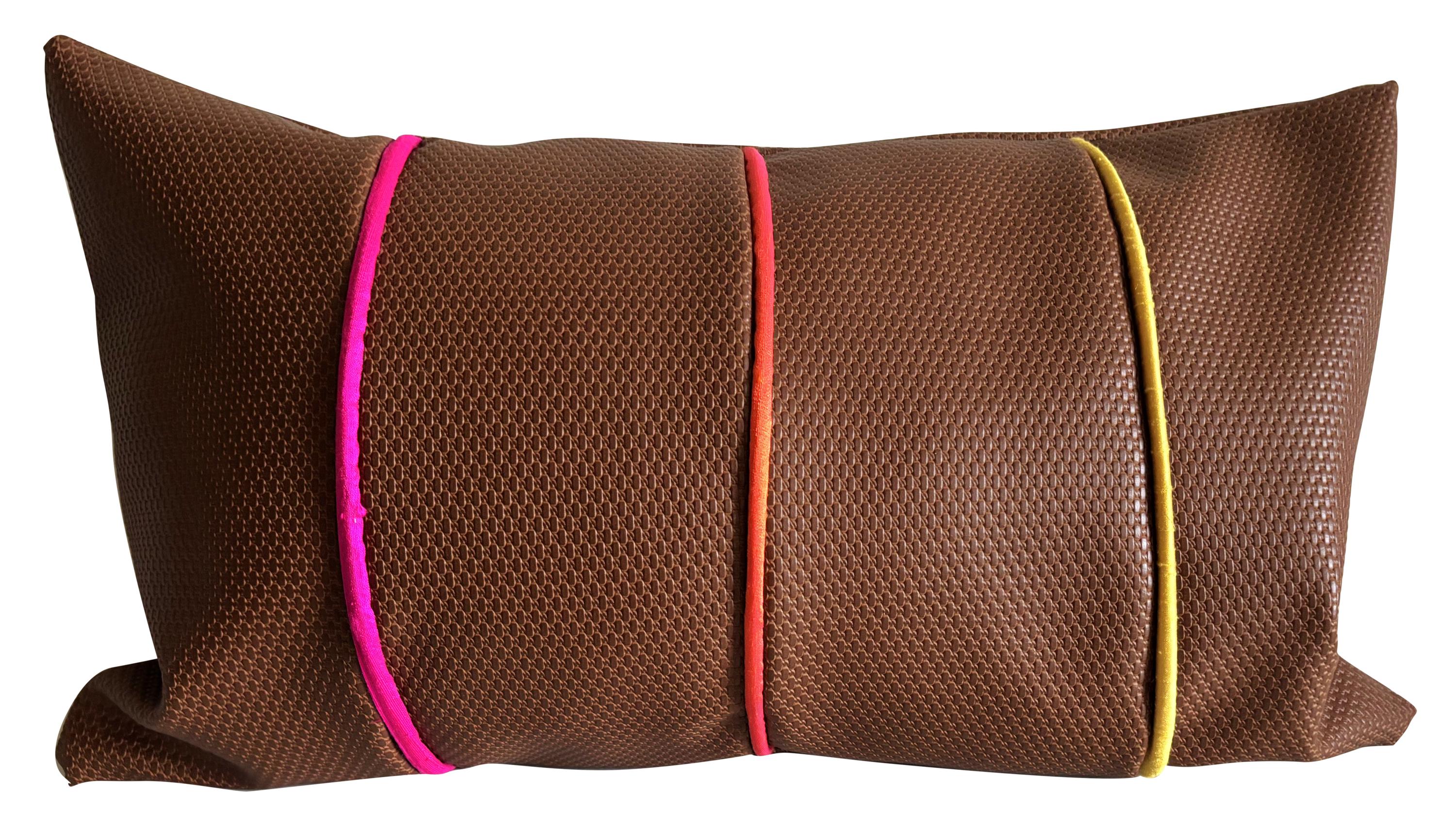 A stunning design by Pretty Cushions. Vegan Leather with Silk Dupion Rainbow Piped Accents. Pure luxury and elegance, handcrafted and one of a kind.